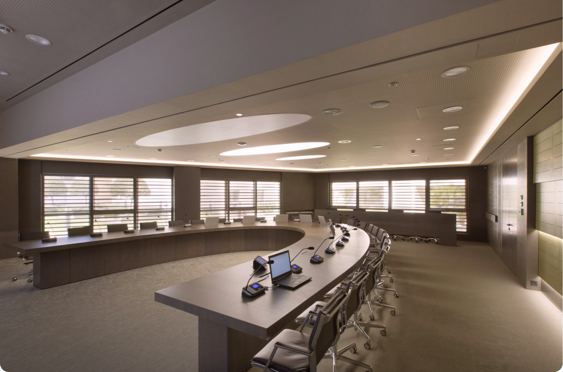 - Dual displays, ceiling microphones (invisible), top-tier PTZ cameras, control system for lights/blinds.