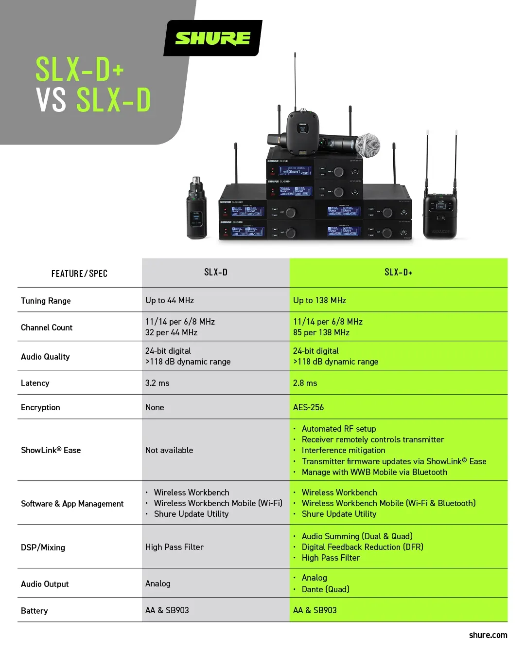 Spoločnosť Shure naďalej vylepšuje a posilňuje možnosti SLX-D s prenosnými prijímačmi, štvoritými prijímačmi a širokým spektrom systémových konfigurácií. SLX-D+ je najnovšie vylepšenie tejto platformy. S bezdrôtovým systémom SLX-D+ získate bezdrôtovo špičkovú a efektívnu automatizovanú správu systému, ktorá sa prispôsobí vašim potrebám pri živých vystúpeniach, inštaláciách, zvuku na mieste alebo prenájmoch.